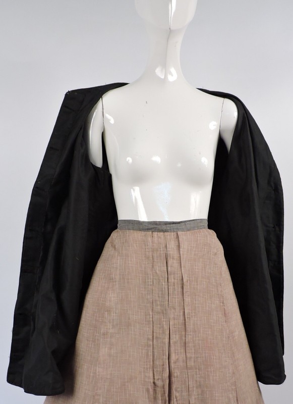 Guys guys guys! its a 28 inch waist! that would fit the average women today! Granted paletots were often larger to accomate a dress and trim without being too tight. The satin piping is also interesting. There are velvet paletots in the met museums collection but most have satin binding or have a cotton binding. Without seeing the actual item its hard to tell if it is binding or piping being used. The hidden buttons are also quite unique. This might actually be a little bit later, more late 1860's, early 1870's with the flat front and more fullness in the back